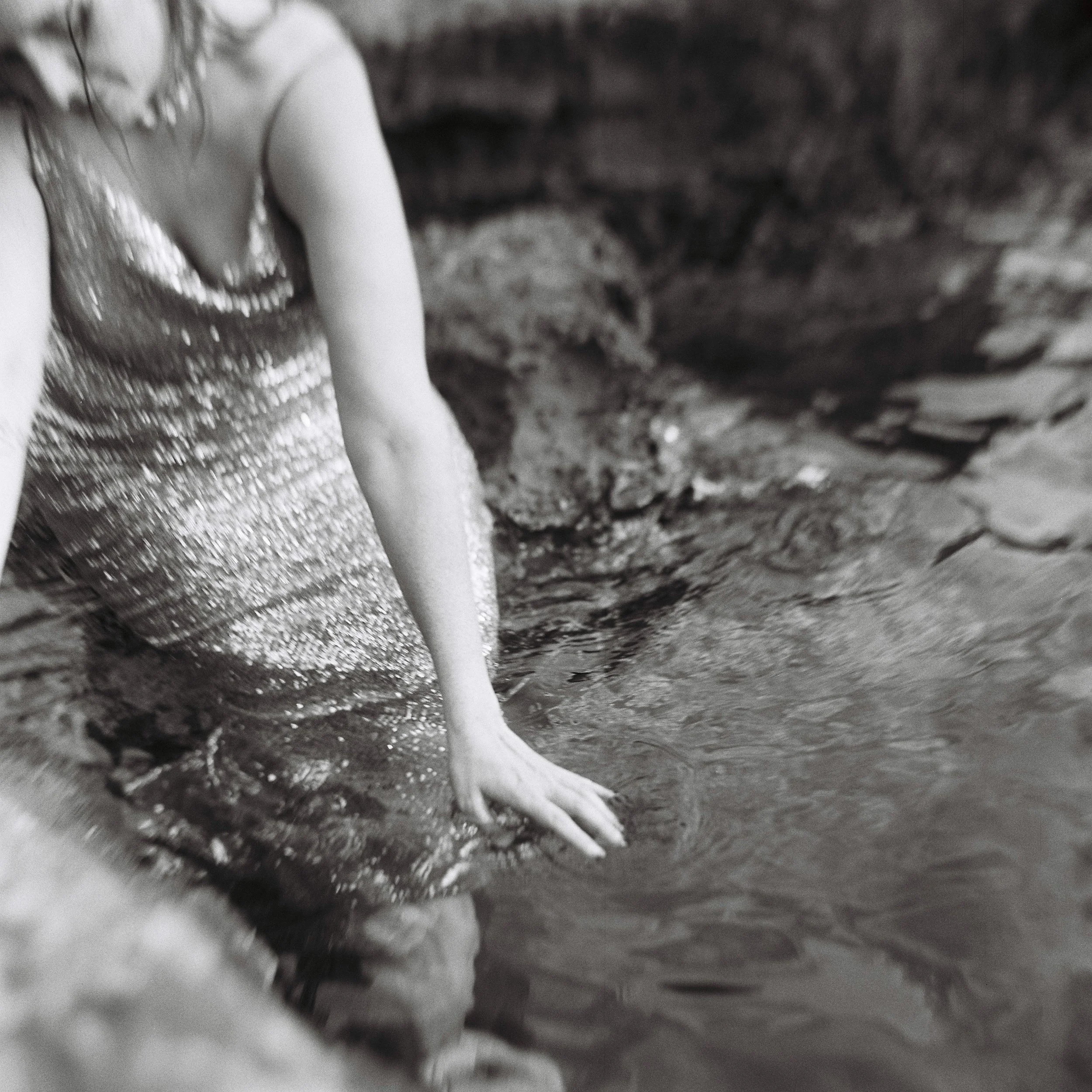 Close-up of a young person touching their cheek, with sand on their hand and face, and a serene expression. View fullsize
