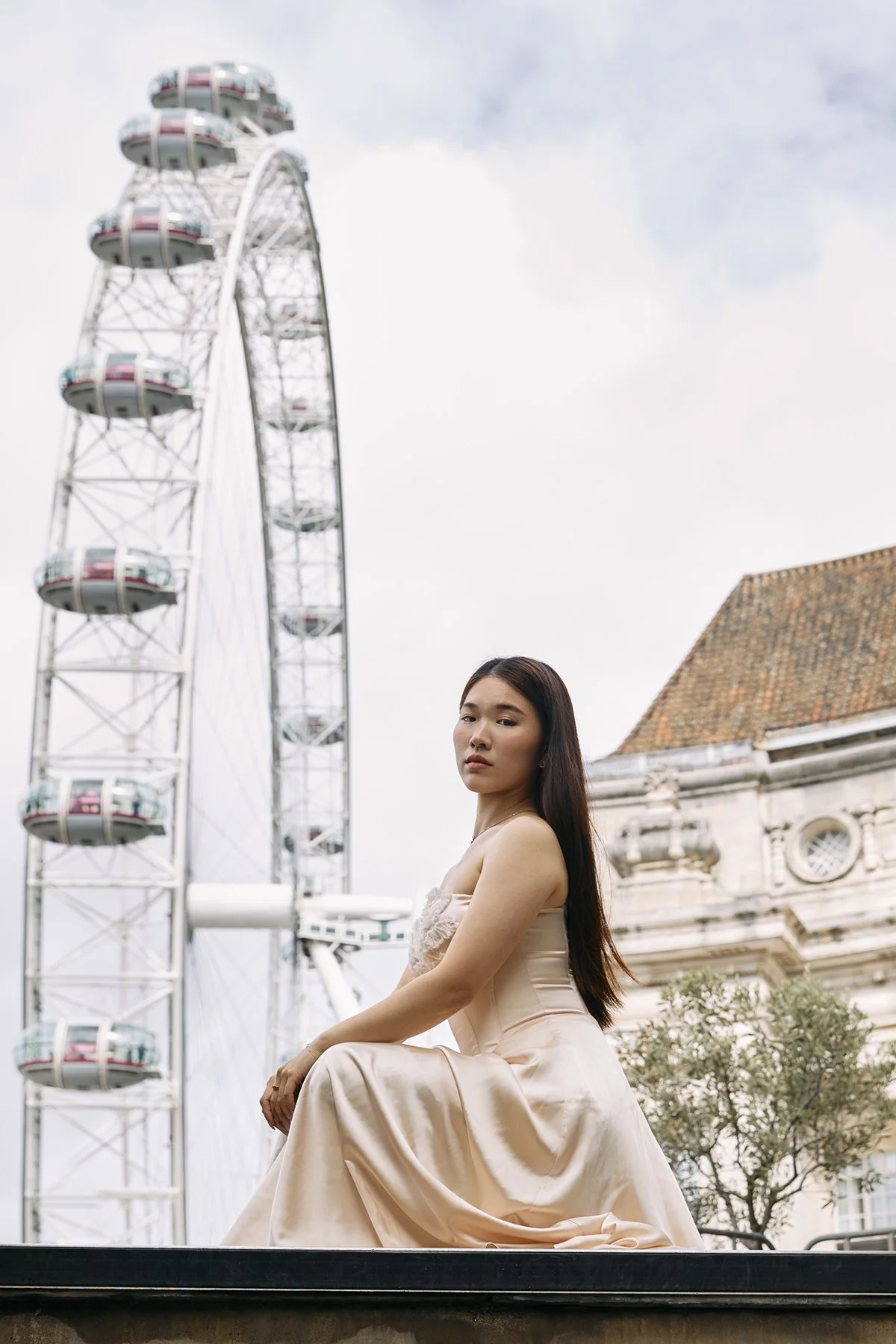 A woman in a satin beige dress sitting outdoors with a Ferris wheel and historic building in the background.