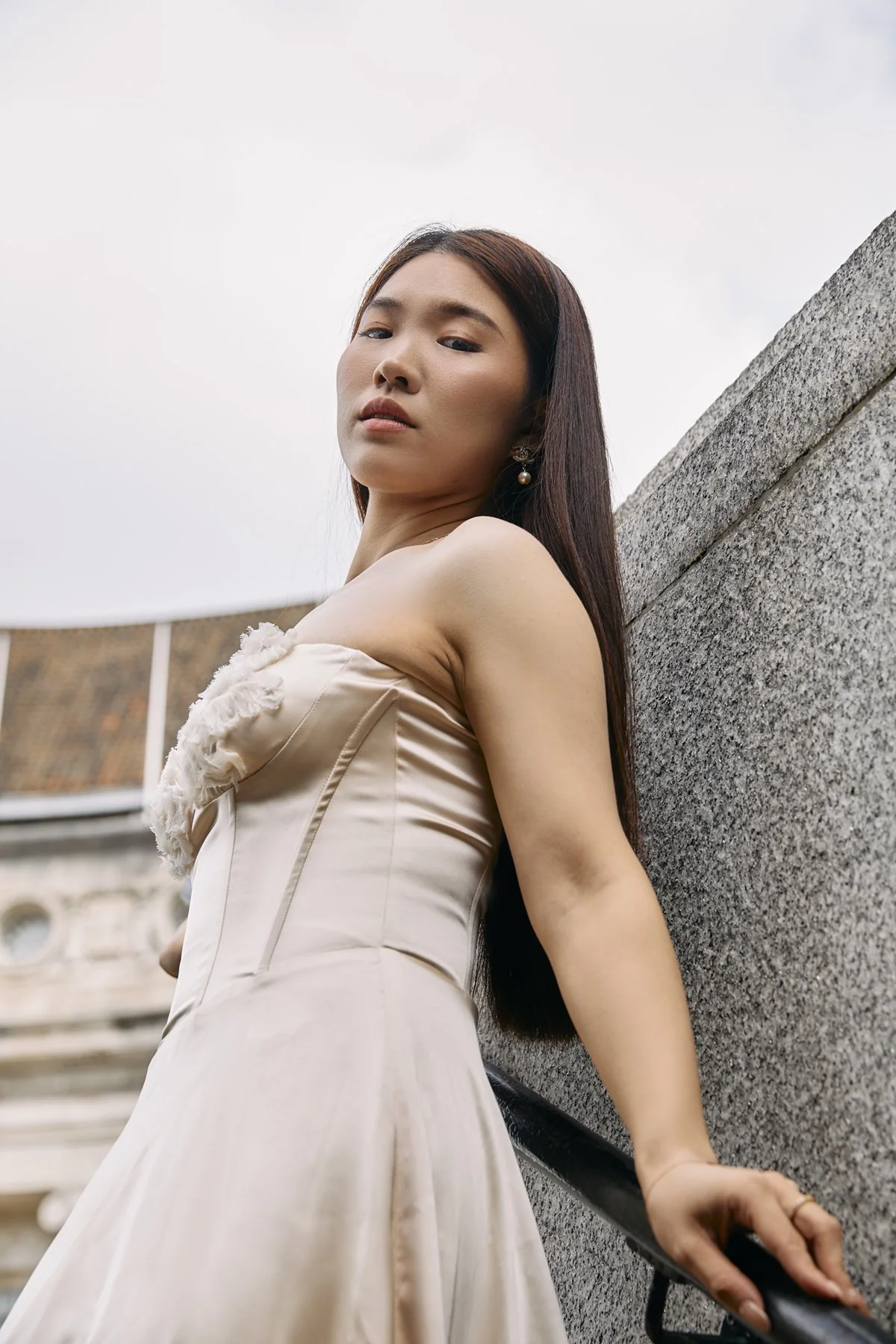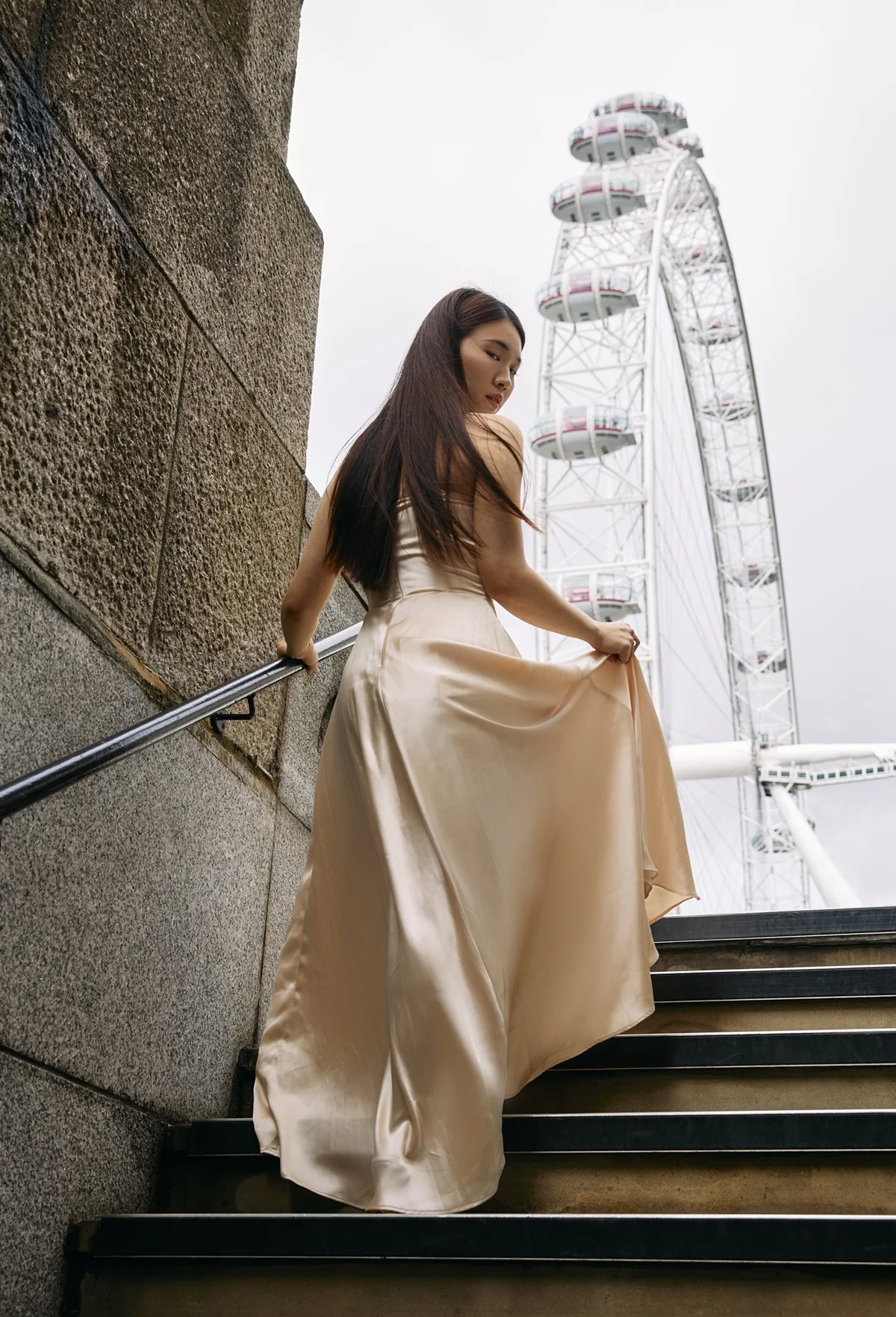 A woman in a beige satin gown standing on stairs near a stone wall, with a large Ferris wheel in the background.