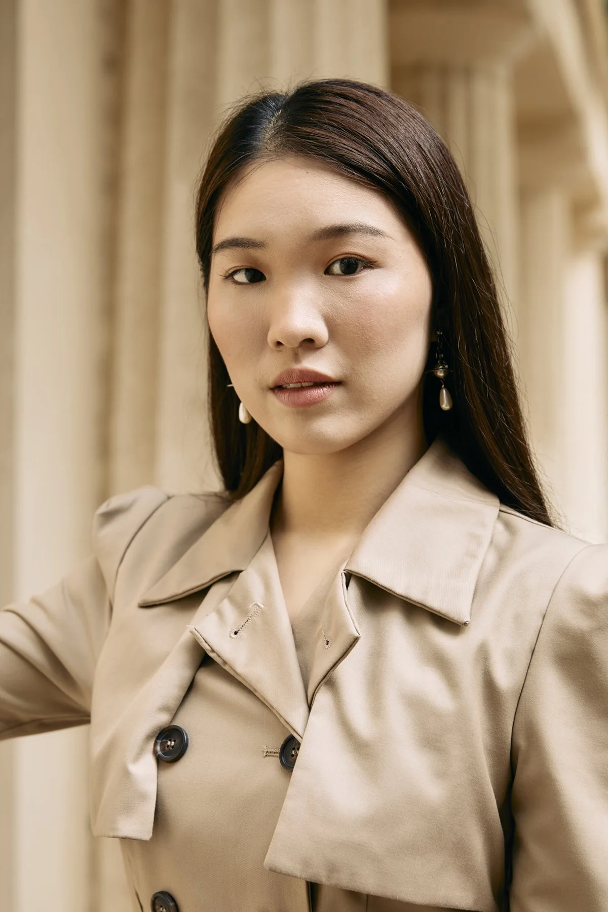 A young woman with long dark hair wearing a beige trench coat and earrings, standing outdoors near columns.