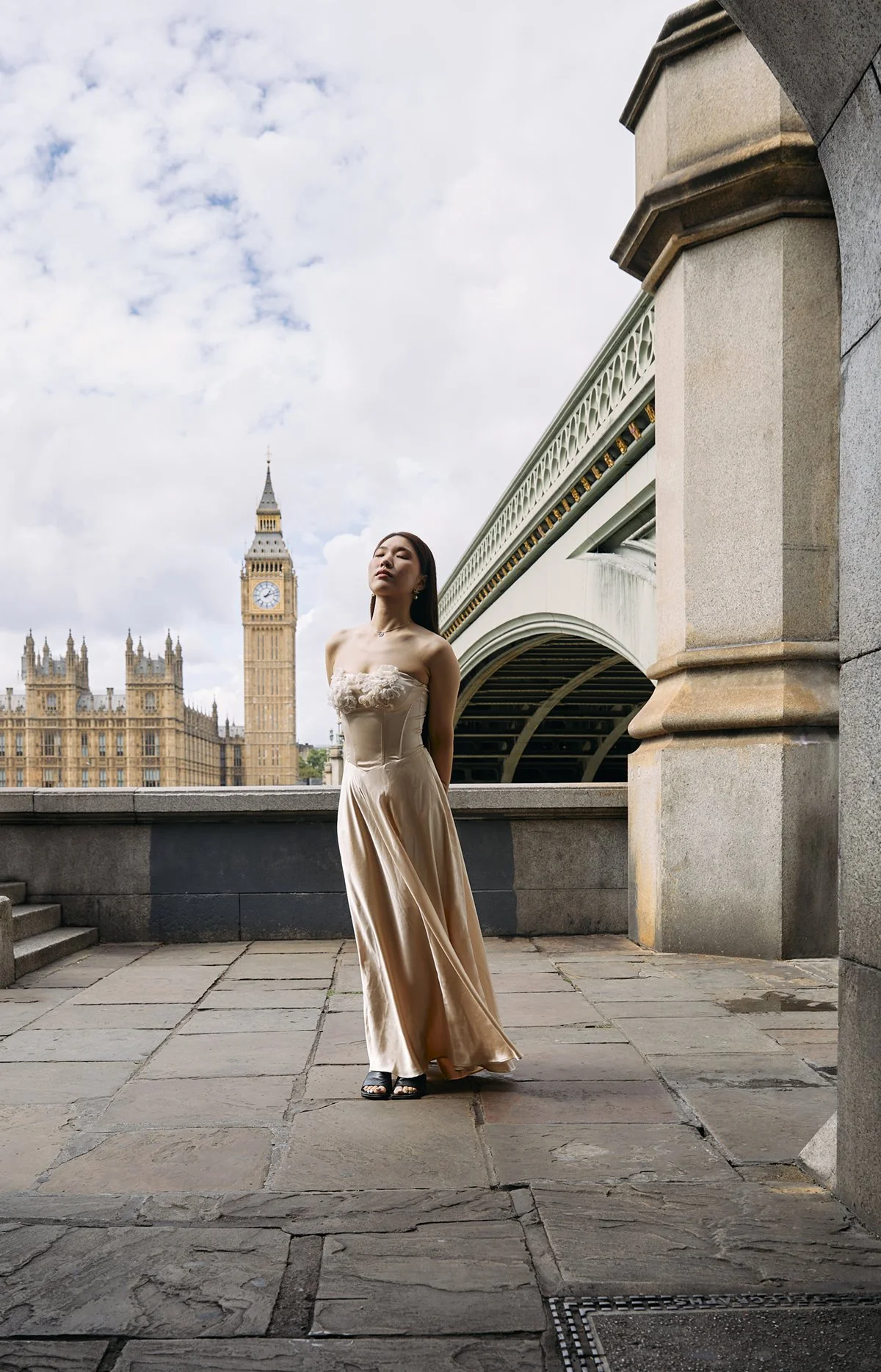 A woman in a strapless gown standing on a stone-paved terrace with Big Ben and the Houses of Parliament in the background, under a partly cloudy sky.