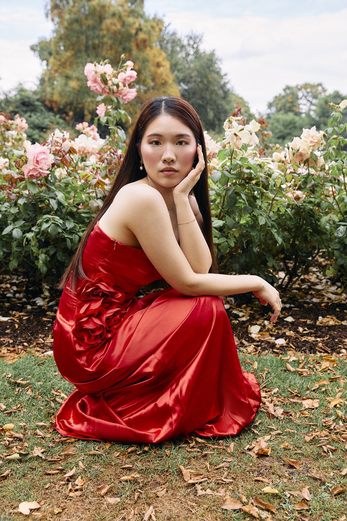 A young woman in a red satin dress crouches on grass among pink and white roses in a garden.
